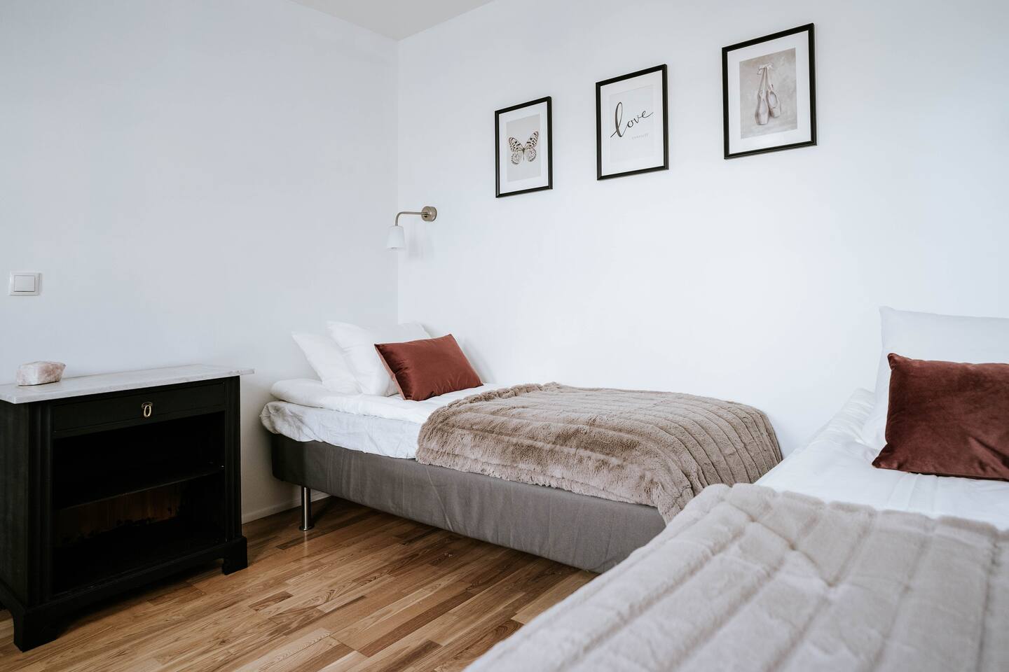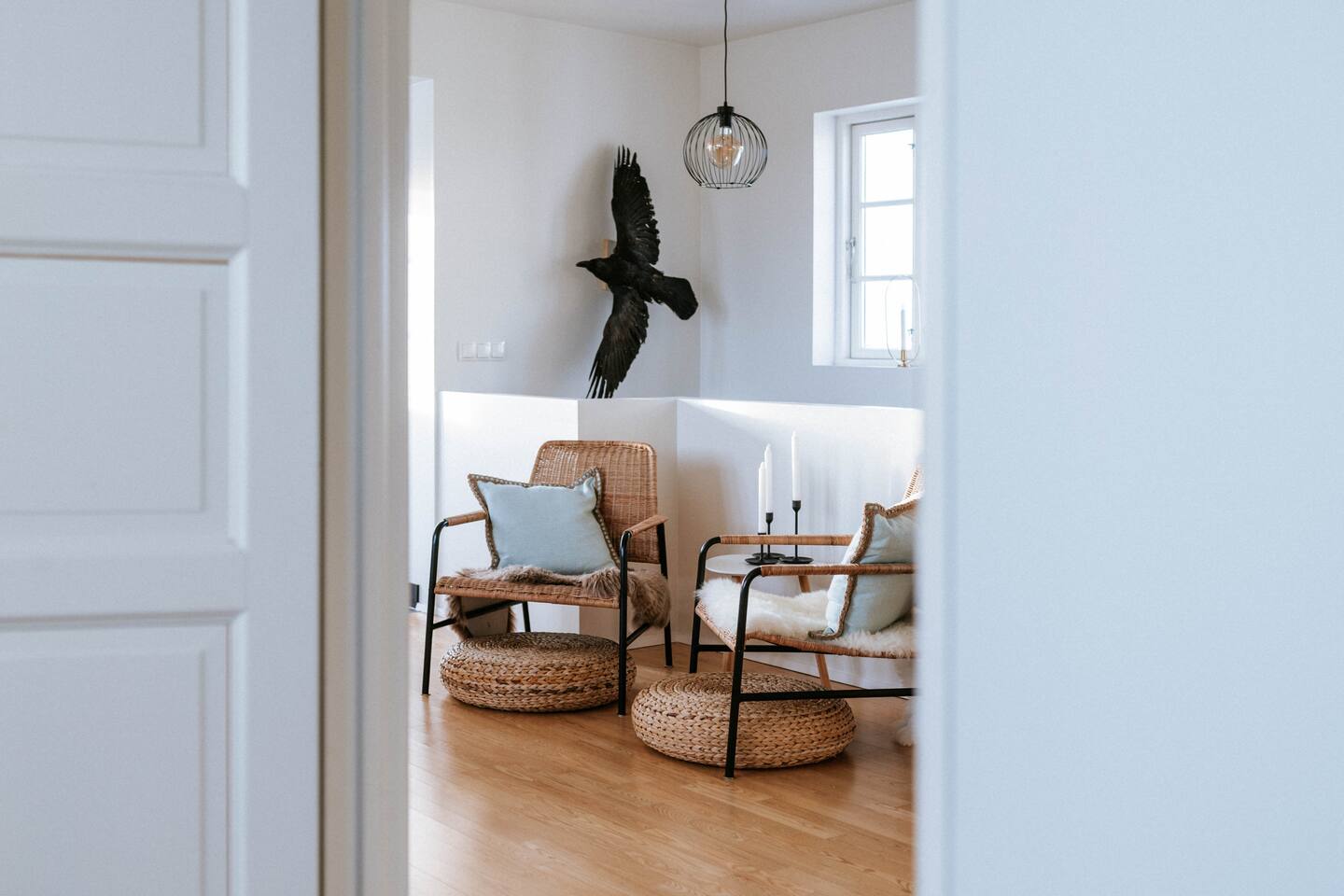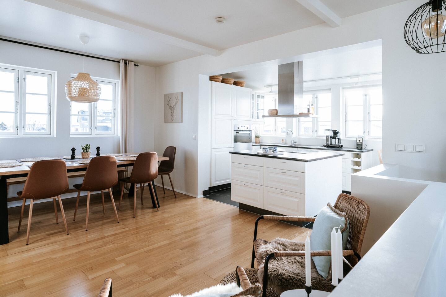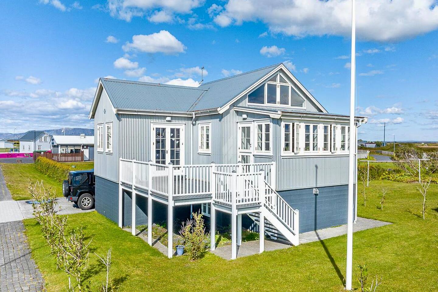 Steps from the North Atlantic Ocean sits Skálavík—also known as Cabin Cove by the Sea—in the quaint village of Stokkseyri. The original home was built in Reykjavík in 1933 and later relocated here, giving it a blend of history, Scandinavian simplicity, and soft, airy light. The two-level layout works beautifully for a couple or small family. There’s even an outdoor play area next door for little travelers. Inside, you’ll find natural materials, rich textiles, and a soothing palette that creates a clean, warm, and relaxed atmosphere. Modern comforts include Wi-Fi, a smart TV with streaming, under-floor radiant heating, and a washer and dryer. Families will also find a pack ’n play, children’s books, a few toys, hangers, room-darkening shades, and clothing storage—small touches that make the stay smoother. Living Spaces After a day exploring waterfalls or glaciers, ease into the comfortable living room. Settle in with a book, enjoy a cup of tea by the French doors, or simply take in glimpses of the village. With soft textures, natural fibers, and abundant windows, the space feels bright by day and cozy at night. Downstairs, a second living area offers a relaxed TV zone. The 55” smart TV provides streaming options—perfect for a little downtime with an Einstök or your favorite drink. Kitchen & Dining The kitchen is fully equipped for easy meals at home, with quality cookware, dishes, utensils, sharp knives, a microwave, toaster, kettle, coffee grinder, and basic spices. High-end appliances and generous counter space make meal prep simple and enjoyable. A small breakfast table is ideal for quick morning coffee before heading out. For shared dinners, the dining table seats up to eight in the open living area, warmed by a natural fiber pendant light that gives the room a soft, inviting glow. Bedrooms & Baths Upstairs Bedroom The queen bedroom upstairs is serene and comfortable, with soft linens, calming neutral tones, room-darkening shades, and plenty of natural light. It’s a restful retreat at the end of each day. Downstairs Bedrooms The first downstairs bedroom is tailored for kids, with two twin beds, cozy blankets, furnishings, convenient reading lights, and bright windows. The second downstairs bedroom features a super twin bed, soft textures, and a peaceful, simplified design. Bathrooms The downstairs full bath has a walk-in shower, radiant heated floors, complimentary soap and shampoo, and a hair dryer. The upstairs half bath offers a toilet and sink for added convenience. The laundry room (with washer and dryer) is located downstairs. Outdoor Amenities Enjoy sunrise, sunset, or a bit of Aurora watching from the upstairs deck accessed through the living room’s French doors. You’ll have views of the sea, the village, and the surrounding landscape—including the nearby historic cemetery, a simple and serene part of the neighborhood. The green space next to the house is spacious—great for kids to run, a casual picnic, or simply stretching out on a blanket to take in the fresh ocean air. Private parking is available on the driveway and accommodates two vehicles.